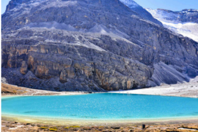 碧蓝,山上成瀑,以其玲珑秀雅水色翠蓝而著名,牛奶海上方有大片的冰川。