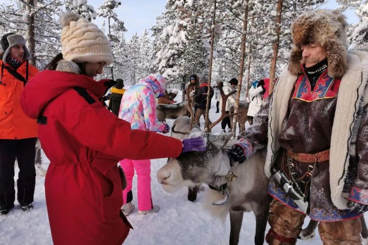 ⊙早餐后,驱车前往萨米原始民俗村★(入内,约1.5小时),露天的博物馆,当地人叫它“萨姆-斯特”,意思是“萨米村”,萨米族是俄罗斯最古老的土著民族之一。抵达后有萨米人穿着装民族服饰用萨米语欢迎客人到来,然后由萨米人带领参观民族村,与驯鹿亲密接触,体验喂养驯鹿(约15分钟),随后体验驯鹿拉雪橇★(拉一圈,约3-4分钟),畅享穿越林海雪原的乐趣。
