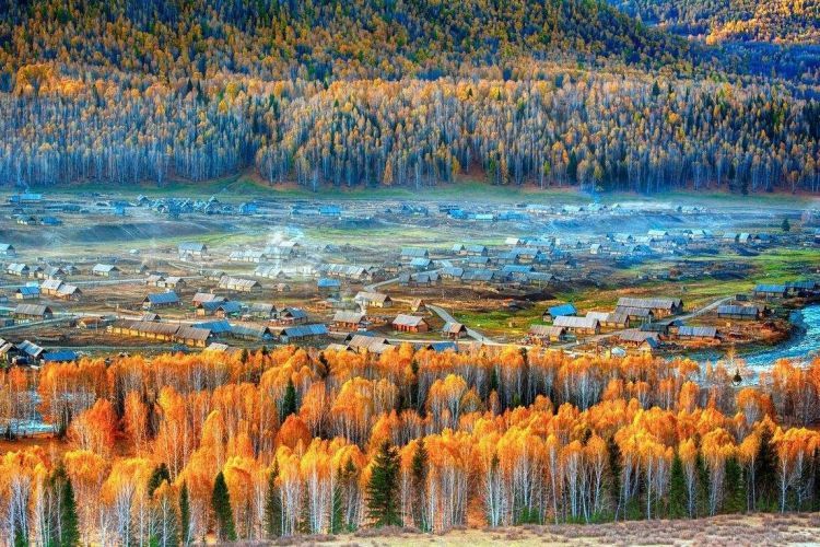 【禾木村】(含门票+赠送区间车,游览时间为早晨至中午2点),禾木是长约一两公里的村庄,全部是木屋。每个木屋旁都有牛栏和高高的草料堆。村中有很多独立的白桦树,白色的树干,金色的树冠,非常漂亮,和四周褐色的原生态木屋相映衬,再加上早晚袅袅炊烟,真是绝佳的民族村落风景图。每到深秋,四周一片金黄,灿烂的耀眼村的一侧有一个很好的高坡平台可以观赏全乡景色。