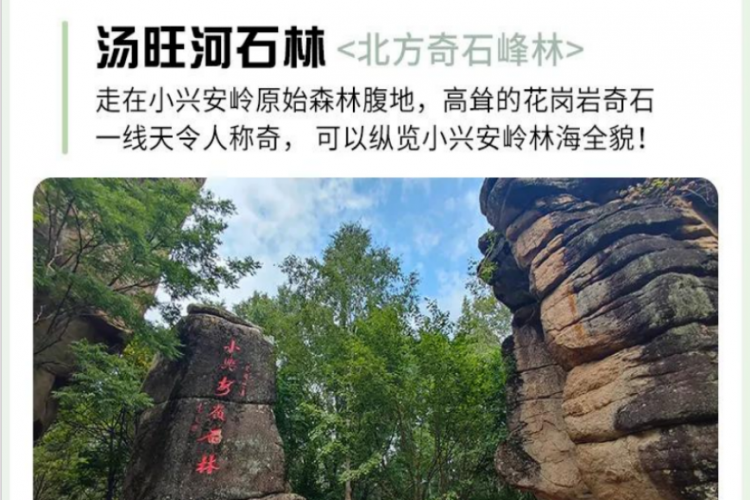 【东方九寨沟~浩瀚林海 ,惊世矿石 ,汤旺河石林】中国第一个被批准的国家公园汤旺河石林融奇石、森林、 冰雪、峰涧、湖溪于一体 ,集奇、秀、险、幽于一身。进入景区你可以欣赏到一线天—天马岩—兴安叠岩— 佛祖峰—龙凤呈祥—悟能望月等象形石风景观。体会“树在石上生,石在林中藏。”的奇特景观。还可以观赏 到亭亭玉立的白桦林,,杜鹃盛开的时候如红霞栖树。在广袤密林里手捧奇花异草 ,伴着山间小溪流水淙淙 , 与云南石林的唯石独尊、石霸一方不同,号称目前国内发现的唯一一处类型最齐全、发育最典型、造型最丰富 的花岗岩石林地质遗迹的汤旺河石林不只是石头的世界,还给各种林木和植被留出了充裕的生长空间,形成了 石林与树林和谐相处、阳刚与柔美相互映衬、绿色与褐色交相辉映的和美景象。
