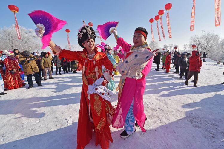 ▲后前往以雾凇景观而著名的【雾凇岛】,办理入住后可体验换装东北民俗服装/满族民族服饰换装,可以在此换上具有东北特色的服饰,如棉衣、棉裤、棉帽等,体验东北的冬季生活,东北扭秧歌是刻在东北人基因里的热闹,锣鼓一响、唢呐一吹,彩绸翻飞间满是烟火气。红绸带甩得带劲,花扇子舞得灵动,踩高跷的扮相逗趣,跑旱船的身姿鲜活,不管是节庆扎堆扭,还是日常广场凑阵乐,都能让人跟着节奏咧嘴笑。民宿KTV是景区内的一项娱乐设施,为游客提供了放松和娱乐的场所。游客可以在此唱歌、跳舞,享受音乐带来的快乐。晚上放鞭炮/观看烟花秀是一项特色活动,通常在特定的时间节点(如节假日或景区活动日)进行。烟花在夜空中绽放,与雾凇景观交相辉映,为游客带来一场视觉盛宴。