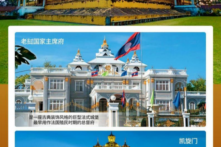 【老挝国家主席府】 老挝国家主席府位于万象湄公河畔,是一座古典装饰风格的巨型法式城堡,最早