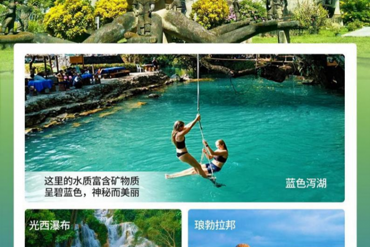 【蓝色泻湖】 这里的水质富含矿物质,呈碧蓝色,神秘而美丽。百年大榕树,枝丫粗壮遒劲,成为了这里最为迷 人的天然跳水台 。在这里 ,尽可以卸下心中所有的顾虑 ,与欧美、韩国的帅哥美女、还有我们纯真的孩子们一起在这 林间感受惊险心动的森林跳水和水中的撒欢嬉戏,一同重温童年的酣畅与美好。