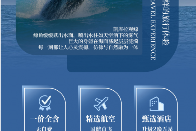 今日亮点:寻找抹香鲸的踪迹,去观赏一场来自海洋精灵的华丽表演;从千层薄冰饼岩的奇特岩层,到霍基蒂卡海滩的宁静海景,再到格雷茅斯小镇的历史风情,尽览西海岸的独特魅力。 早餐后,开始您今日的奇妙之旅: 【凯库拉--出海观鲸--寻找抹香鲸的踪迹】(约3小时往返) 凯库拉是著名的观鲸圣地,一年四季都适宜观赏地球上最大的有齿鲸鱼---抹香鲸。抹香鲸我们观鲸团的主角,身长可达18米体重超50吨,它们常年在凯库拉海域游曳捕食,喷着几米高的水柱,经常在下潜时给客人展示它巨大的鲸尾!全年观鲸成功率95%以上。在旅程中你还有机会看到见成群的暗色斑纹海豚,以及濒危的漂泊信天翁。在凯库拉时常会有世界最大的海豚科动物——虎鲸出没,同时这里也栖息着世界最小的贺氏矮海豚;以及各种的海鸟,包括13种信天翁、14种海燕等。 离开海岸小镇凯库拉,沿着壮阔的南岛西岸公路前行。海浪与山峦相伴,蓝天与白云为旅程绘出最柔和的色彩。途经森林、河谷与湖泊,一路皆是风景,每一眼都像新西兰的诗篇。 【千层薄饼岩】(约20分钟),形成于3千万年前。成千上万年以来,小型海洋生物和沙土间交替层压并埋于海底,产生了硬石灰石和软砂岩堆积而成的多层区域。地震活动让海底水平线上升并最后干枯。而那些慢动作的艺术家---雨和风,开始侵蚀软砂岩。最后数以百计的地层沿着悬崖沟壑垂直形成,如同巨大的层层薄饼,被称为“大自然的年轮”,让人惊叹大自然的鬼斧神工。 【霍基蒂卡海滩】(约15分钟)在小城的中心街道就能找到写着Hokitika Beach Access的木制的牌子,走进去就能看到一片非常壮阔的海滩。在晴天,绿草茵茵,蓝天白云,黑色沙滩上有白色的石头。海滩上还有各地艺术家用树木做出的艺术品,非常漂亮! 前往充满西海岸野性魅力的格雷茅斯小镇: 【格雷茅斯小镇】(约30分钟)格雷茅斯,毛利语名为“Māwhera”,意为“宽阔的河口”。小镇位于格雷河入海处,是西海岸的门户与灵魂。这里曾是矿工与淘金者的聚集地,留下了丰富的历史痕迹。如今,格雷茅斯在大自然的怀抱中静静呼吸,远处是连绵的群山,近处是翻涌的海浪,既有粗犷的力量,也有温柔的宁静。 凯库拉简介:凯库拉是观赏各类野生动物的大本营,也是享用小龙虾的天堂(在毛利语中,“凯 kai”是指食物,“库拉 koura”是指小龙虾。从基督城出发,向北驱车两小时,就能来到凯库拉享受无限乐趣。 凯库拉拥有壮丽的自然环境---村庄就坐落在凯库拉山脉与太平洋之间。邂逅海洋哺乳动物是凯库拉最独特的魅力---鲸鱼、皮毛海豹和海豚长期生活在沿海水域。 【特别提示:因航班情况、季节及南岛酒店资源有限等因素,新西兰的内陆航班可能会根据情况调整航班日期、时间及城市顺序,并相应调整入住城市,个别城市为三星酒店或Motel,且不再另行通知,感谢您的理解与配合,谢谢!】 | |||||||
